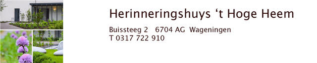 Herinneringshuys ’t Hoge Heem in Wageningen is een warm en toegankelijk uitvaartcentrum voor een persoonlijk en rustig afscheid. Aan de Buissteeg 2 vindt u een vertrouwde omgeving waar nabestaanden op hun eigen manier samen kunnen komen.