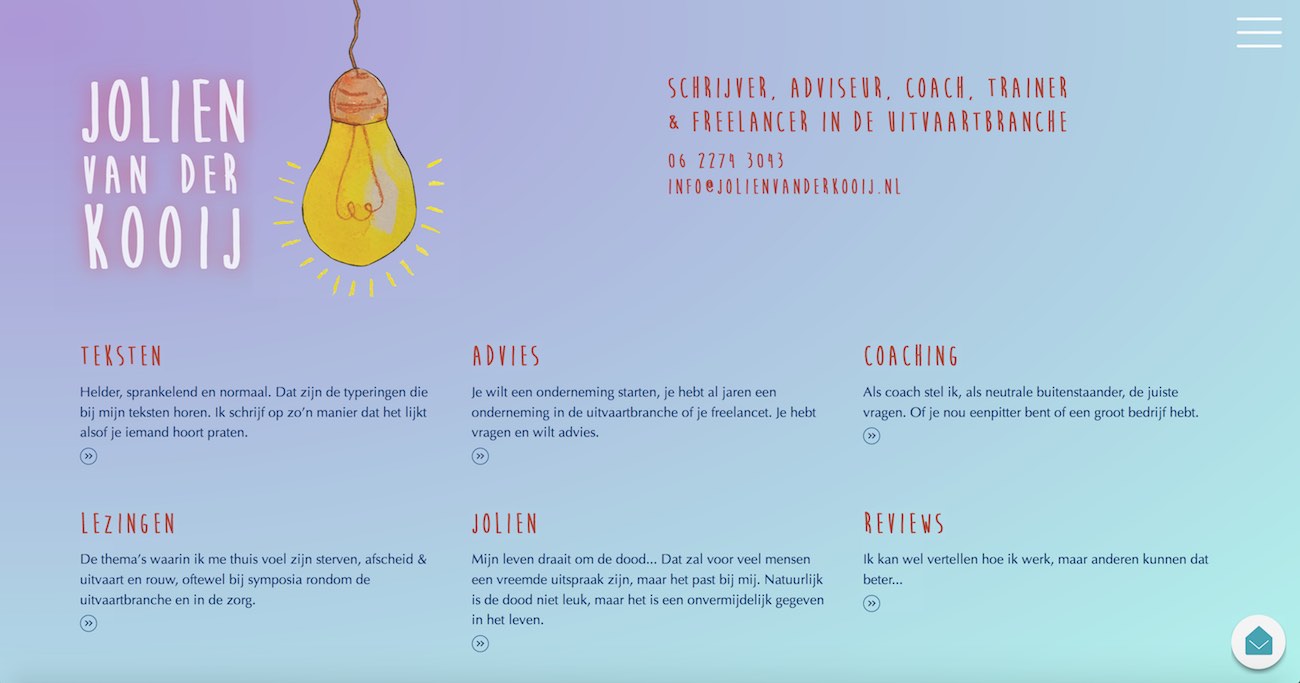 Jolien van der Kooij in Amsterdam is een persoonlijke uitvaartonderneming voor wie waarde hecht aan begeleiding met aandacht, rust en oprechte betrokkenheid. Vanuit de uitvaartbranche is zij actief als schrijver, adviseur, coach en trainer, met oog voor een afscheid dat echt past bij de overledene en de nabestaanden. Zoekt u in Amsterdam een warme en deskundige partner bij een uitvaart, dan biedt Jolien van der Kooij betrokken ondersteuning.